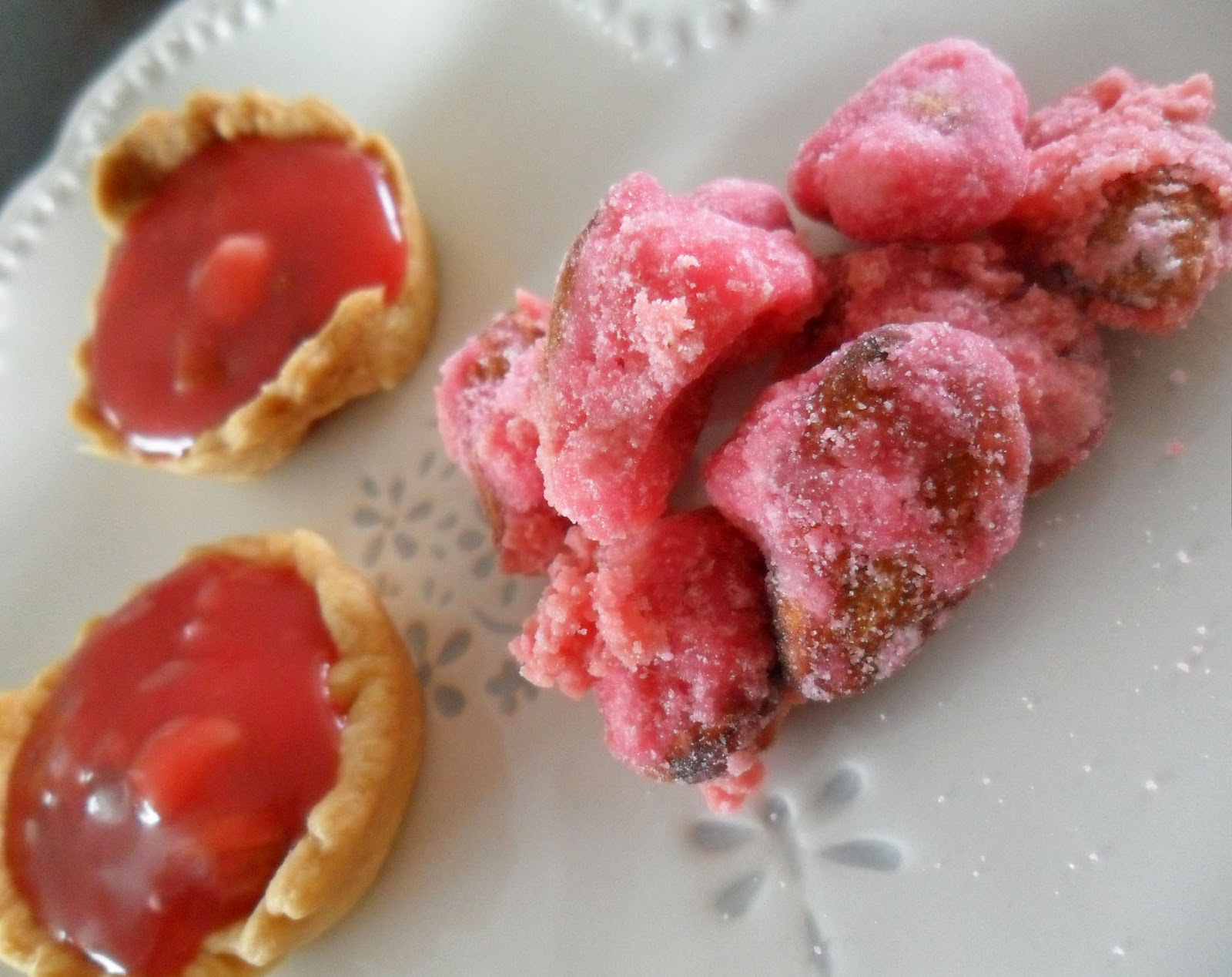 sucre, 10 ml d’eau et 2 gouttes de colorant rouge. J'ajoute les amandes et chauffe doucement en remuant régulièrement, puis, lorsque le sucre commence à fondre, tout le temps, pour bien enrober les amandes. Verser sur un papier sulfurisé et laisser refroidir. Séparer les pralines.